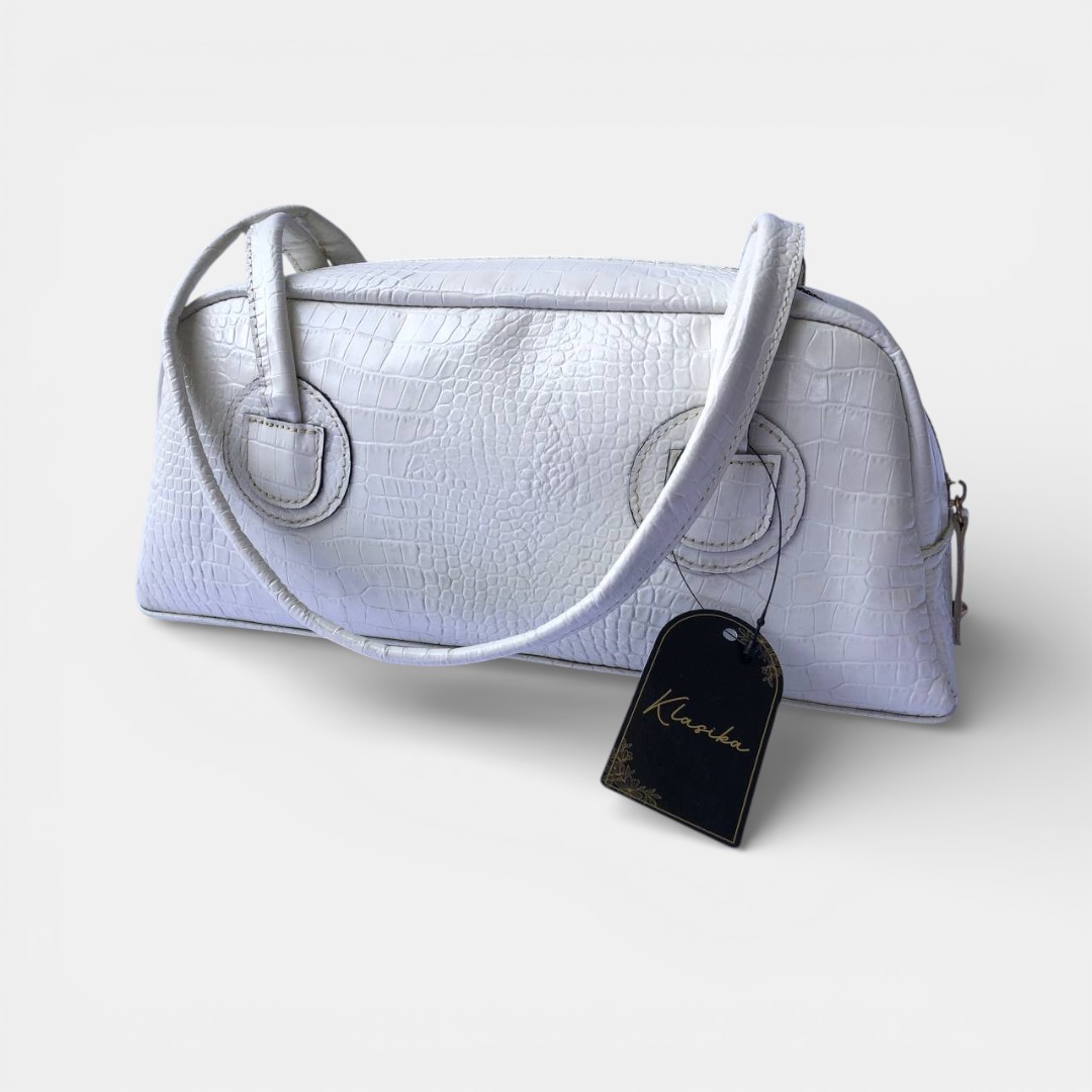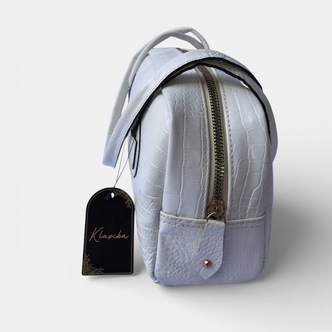 This bag made from embossed cowhide leather with snake pattern ,has one main compartment